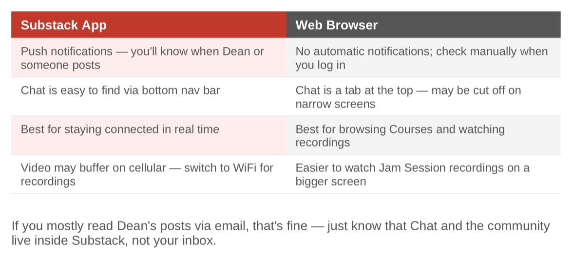 Dean is active in Chat. It’s not a broadcast channel — he reads it and jumps in regularly. Think of it less like a comment section and more like an open group text with someone who actually responds.
