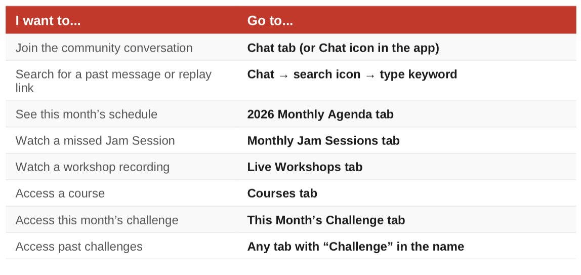 Dates and times are always in the 2026 Monthly Agenda tab. Can’t make it live? Recordings go up in the Monthly Jam Sessions tab shortly after.
